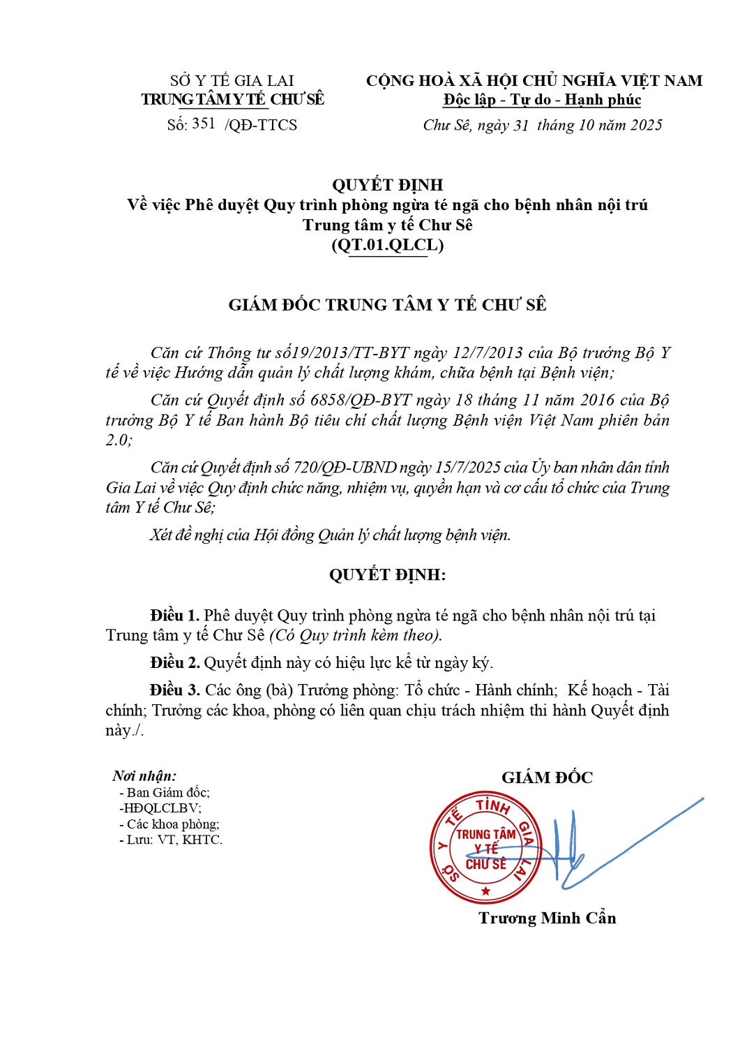 Quyết định phê duyệt Quy trình phòng ngừa té ngã cho bệnh nhân nội trú